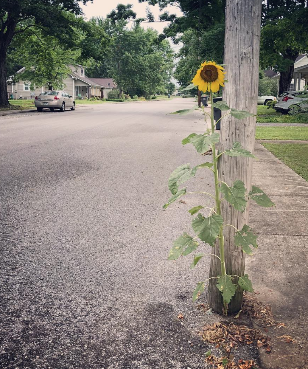 Daughter posted a picture on Facebook of one sunflower plant beside a utility pole. Right in the middle of town. Inches from the sidewalk. A five-foot tall plant growing from a palm-size area of soil surrounded by asphalt. One beautiful bright yellow plate size flower. An unexpected sight.
