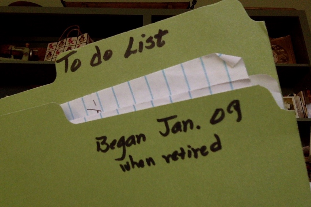 A green folder is in my filing cabinet. It’s labeled “To Do List” with a subtitle “Began Jan. ‘09 when Retired.” After teaching for 25 years, I retired December in 2008. On a cold January morning, I remember sitting in my home closet office in our basement and making a list.