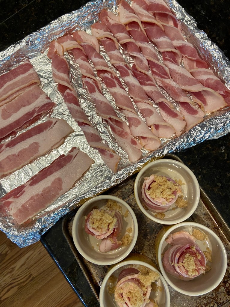 Bacon roses aren’t as delicious as Special Oven Bacon, a tried-and-true recipe. Lay thick bacon slices, cut in half, on a broiling pan or a baking pan. Sprinkle a mixture of ¾ cup brown sugar and one heaping tablespoon flour over the bacon. Then sprinkle with ½ cup finely chopped pecans and bake at 350º F for thirty minutes.
