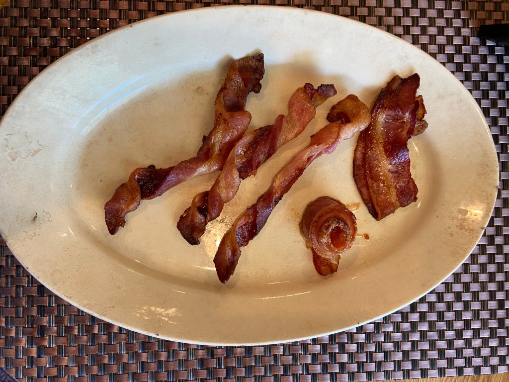 I baked a whole pan of bacon – some twisted, some rolled, some folded. No matter the shape, crispy bacon is mighty good eating. As long as it’s ‘pig bacon,’ as my Grand said when he was 5, and not turkey bacon that his mother sometimes served.