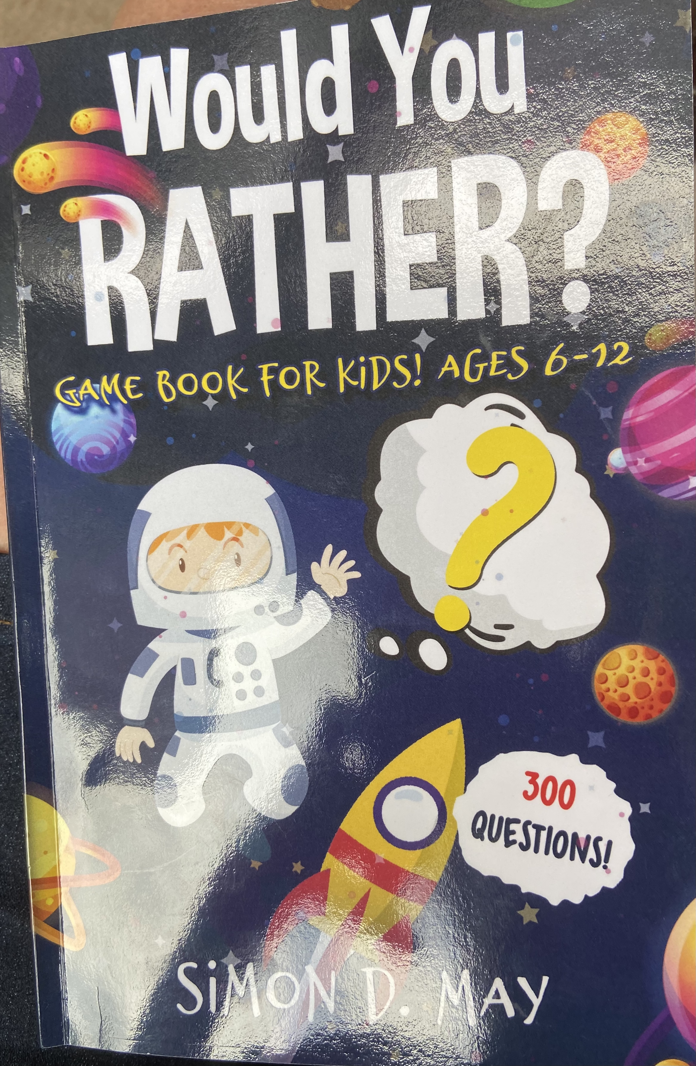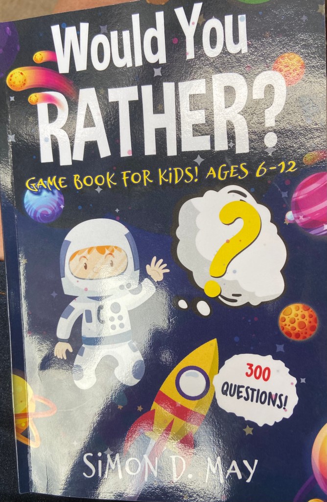 Was the book a game? According to the book’s cover, it’s a game book of 300 questions for kids, ages 6-12. Son read a question aloud, “Would you rather lick the bathroom floor or be toilet paper?”