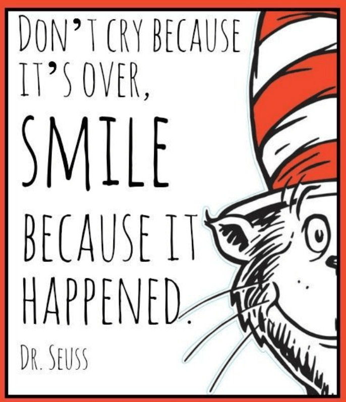 We cherish times that we look forward to and love and wish didn’t end. I think of advice from Dr. Seuss’s book, The Cat in the Hat: Don’t cry because it’s over, smile because it happened.